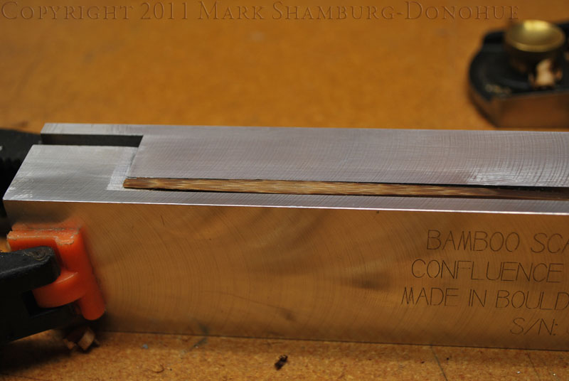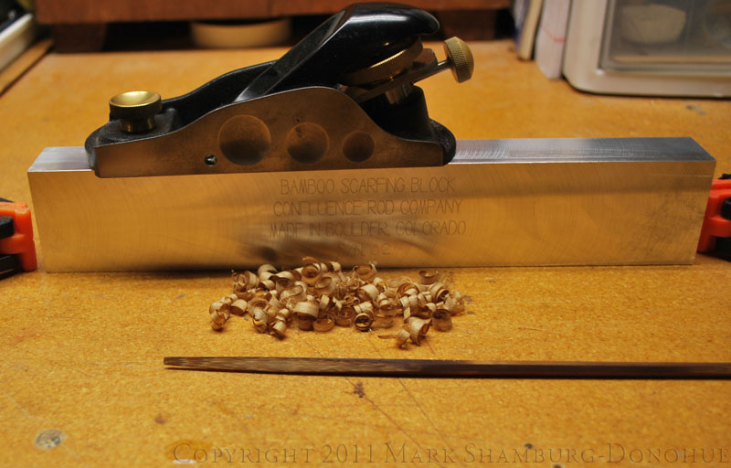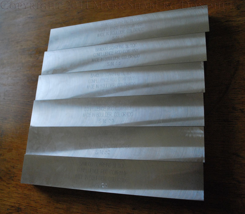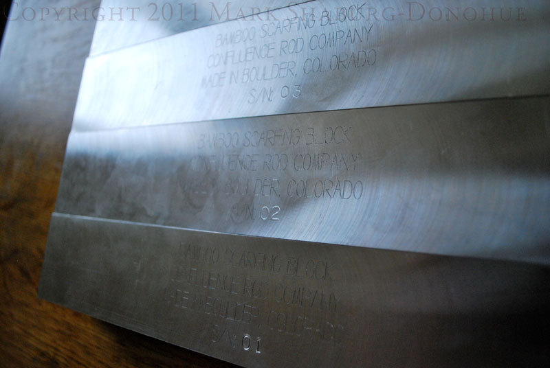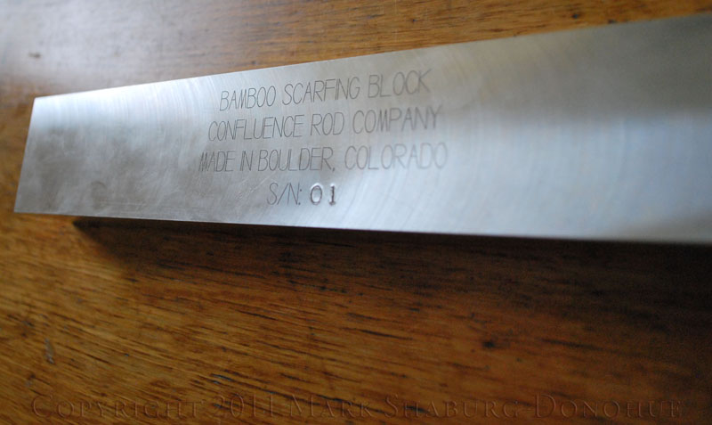 The Confluence Bamboo Scarfing Block The Confluence Bamboo Scarfing Block is made from solid 6061-T6 Aluminum Bar Stock. The block measures 11.5" x 2" x 1.75". The block features a precise 20:1 slope. Perfect for making spliced joint ferrules on spey rods, or scarfing broken rod sections. The Confluence Bamboo Scarfing Block is also perfect for cutting splices for nodeless rods. To use the block, simply lay the bamboo section in the block so the end is aligned with the top of the block and clamp in place with the included spring clamps. Then plane the bamboo until it is flush with the top of the block. Price: $250 including shipping in the USA Confluence Bamboo Scarfing Blocks are currently out of stock. Please email to enquire about the next batch.